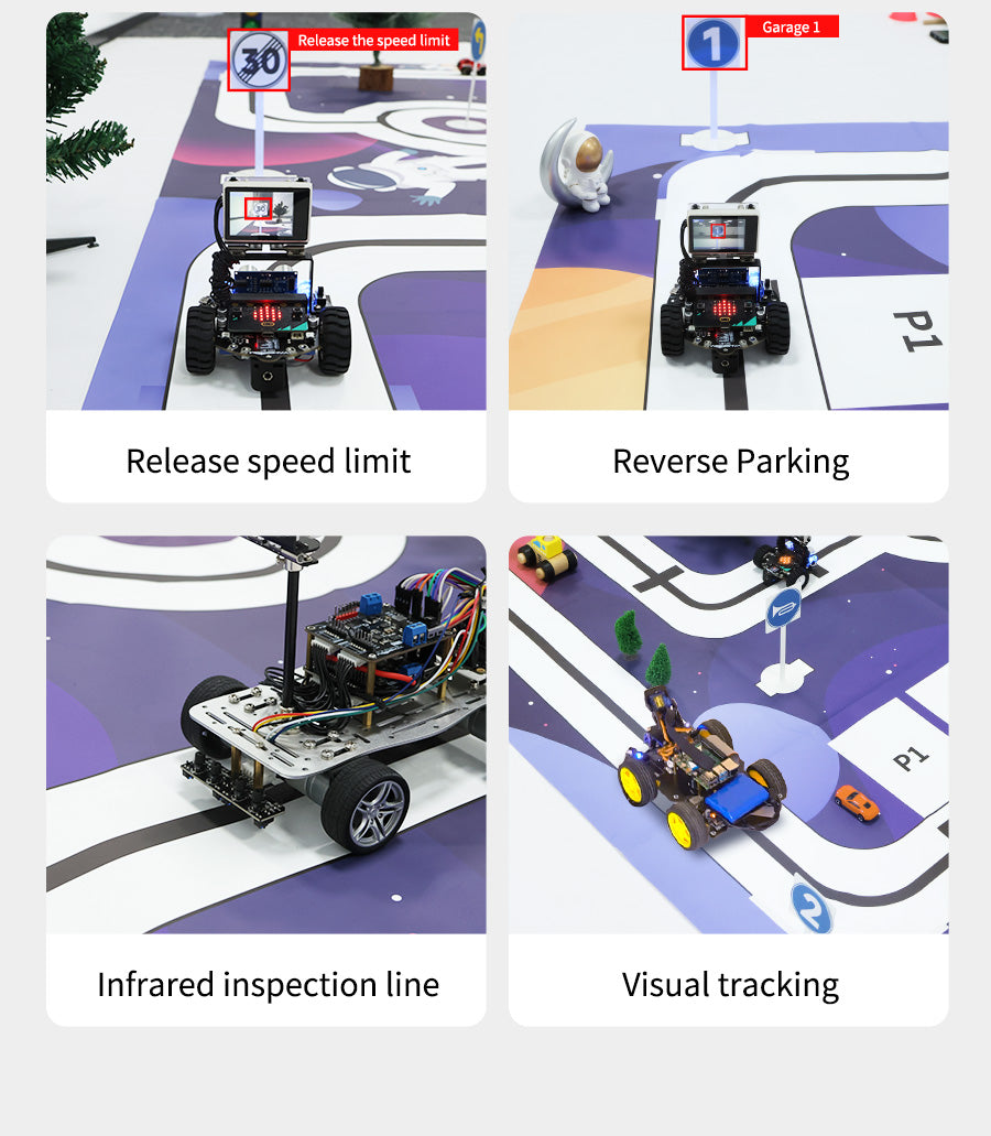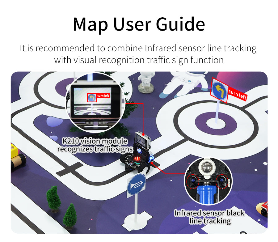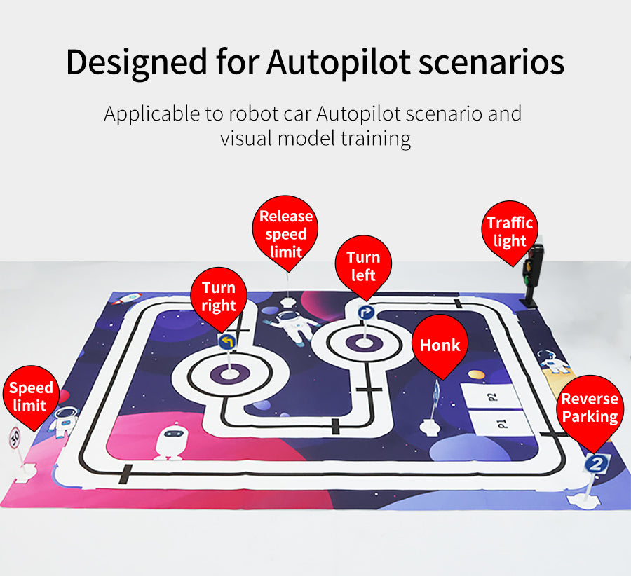 The size of this map is 2M*1.5M. It is made of PVC waterproof material. Yahboom is designed specifically for small robot car tracking line and Autopilot scenarios. On this map, you will see a miniature urban road distribution, filled with various traffic signs, simulating real-world scenes. Combining infrared tracking sensor and AI camera, endow your robot car with real-time perception and visual analysis capabilities, enabling it to drive accurately, avoid obstacles, and steadily move forward.