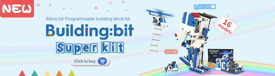 The Building:bit building block kit includes a micro:bit development board, micro:bit professional expansion board, motor, battery, and other accessories. With more than 260 building blocks, it can form more shapes and be controlled by programming circuits.