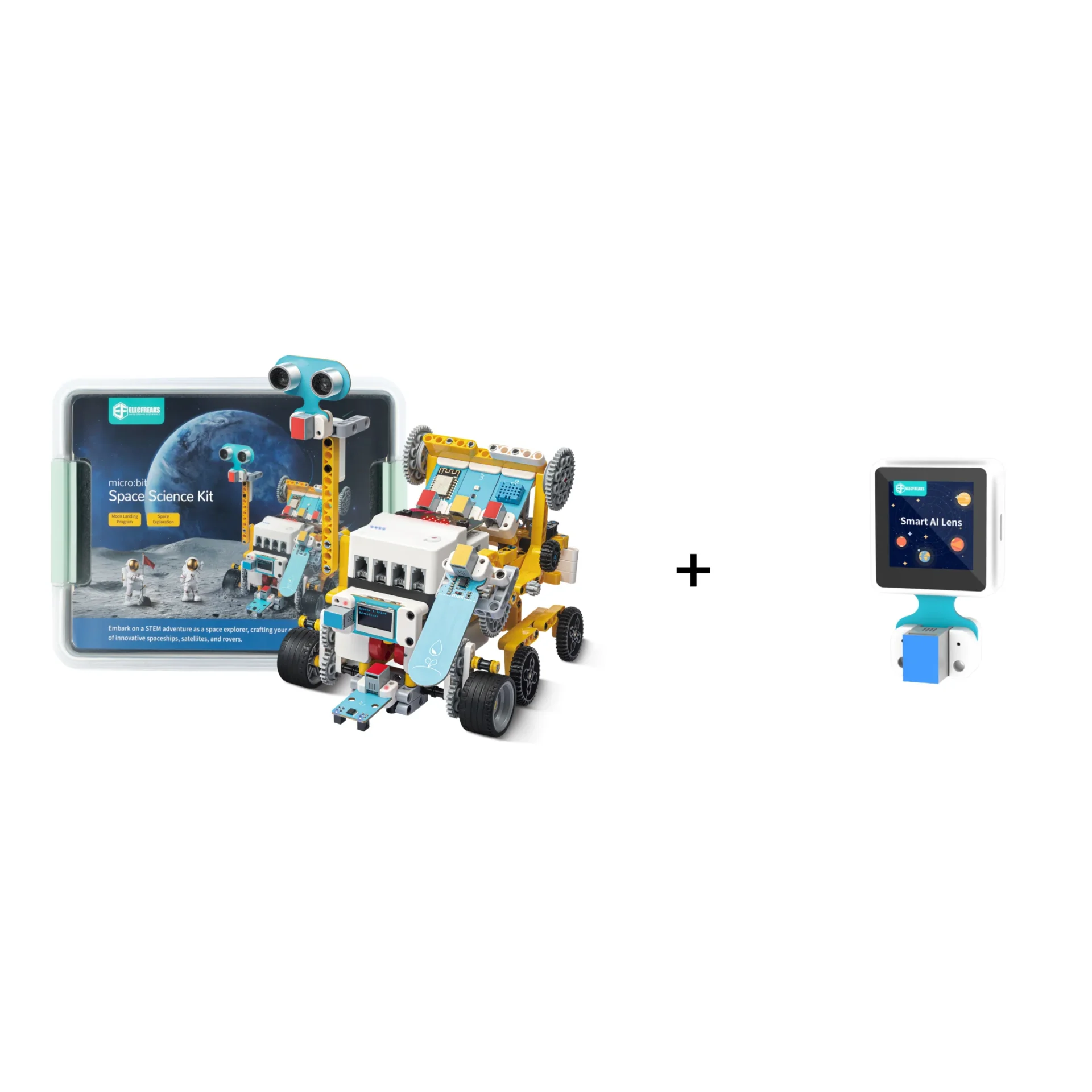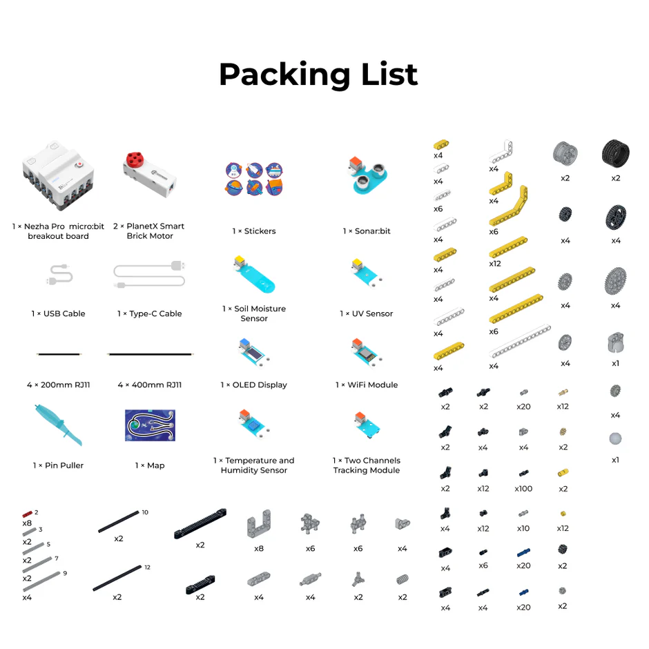 The micro:bit Space Science Kit is a STEAM education kit for elementary and middle school students. The kit uses the Nezha breakout board V2, the PlanetX Smart Motor, a variety of PlanetX sensors, a scenario-based map of the moon landing plan, and several building blocks to allow students to build projects and realize simulation missions on the moon.