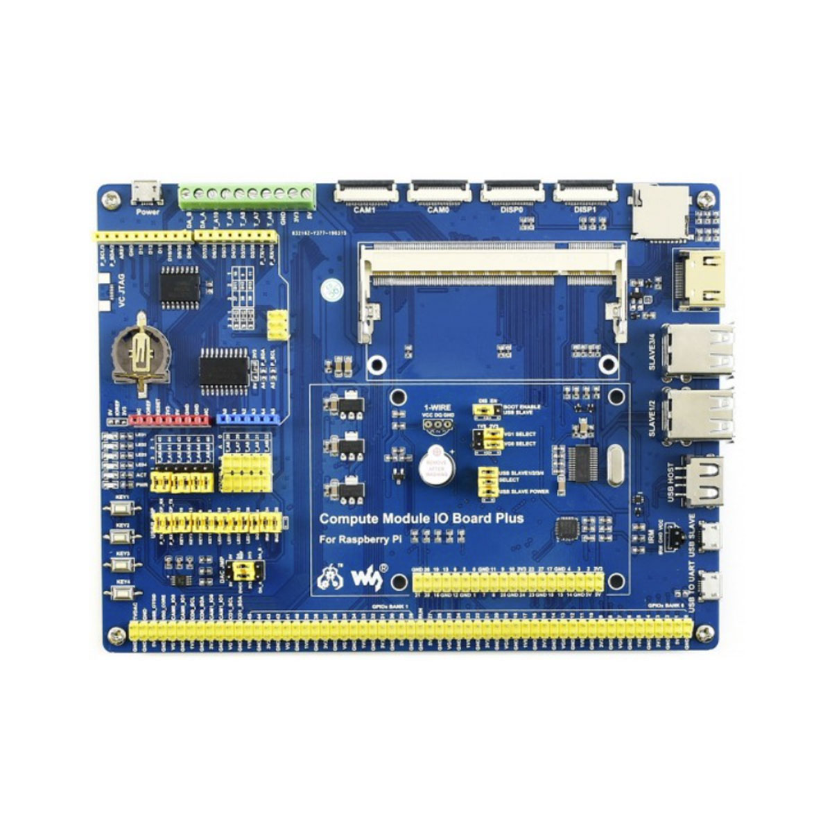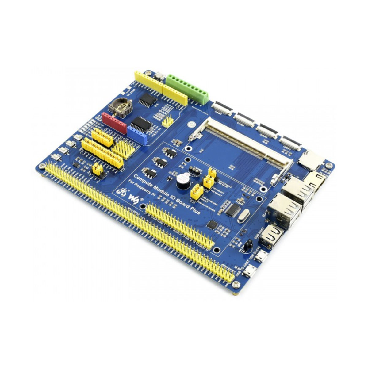 The Compute Module IO Board Plus is a development board which you can plug a Raspberry Pi Compute Module into, and make use of the resources of Pi more flexibly. It is compatible with the Compute Module IO Board V3 from the Raspberry Pi Foundation, along with various common use components.