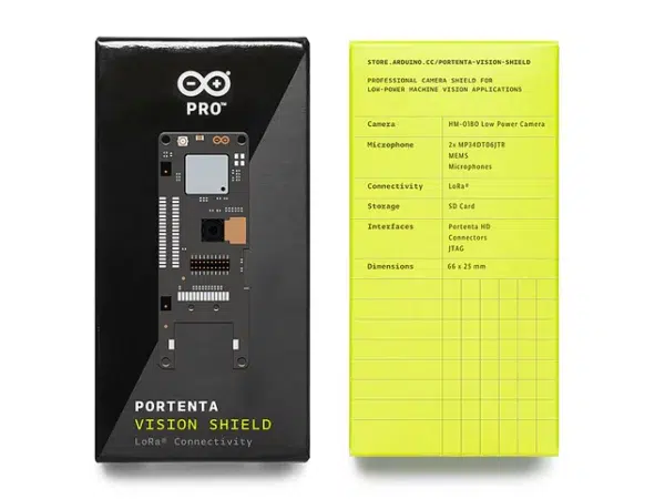 The Portenta Vision Shield LoRa® brings industry-rated features to your Portenta. This hardware add-on will let you run embedded computer vision applications, connect wirelessly via LoRa® to the Arduino Cloud or your own infrastructure, and activate your system upon the detection of sound events.