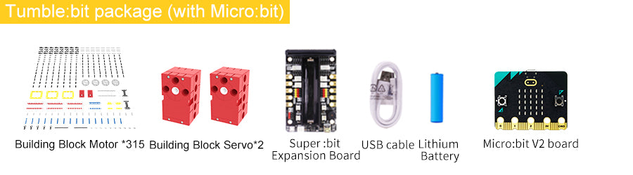 Tumble: bit building kit contains 315 building blocks and two building motors, which can be used to build a two-wheeled balance car and a unicycle. It is equipped with a super: bit expansion board, BBC micro: bit as the core controller, and using MakeCode Editor graphical and Python programming to achieve colorful lights, music whistle and other gameplay. It adopt the physical self-balancing method, the gyroscope calibrates the movement posture in real time, which can keep the car balanced and walk on various terrains. Compared with other building block car, its biggest difference is the use of rubber bands to fix the structure, which has the characteristics of shock absorption, anti-fall, easy cushioning and so on. In addition, it supports Android / iOS dual-system Bluetooth APP control, as well as remote control with a micro: bit handle. We will provide detailed installation tutorials, and it only takes 30 minutes to complete the assembly.